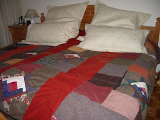 Tässä kuva siis Friedhelmistä sekä tilkkupeitosta, jonka olen joskus vuosia sitten tehnyt. Hyvin yksinkertaisella menetelmällä kaikenlaisista kankaanpaloista. Tilkkutyöt ovat vähän kuin matonkutomista. Niistä löytyy vanhat hääpuvut ja vauvan ensimmäiset potkuhousut. Viime talvena mieheni pakkasi laukkuaan lähteäkseen Rovaniemelle. Hän etsi punaista flanellipaitaansa. Turhaan. Nosti laukun sängylle ja tuijotti eteensä. Flanellipaidasta oli jäljellä neliönmuotoiset palaset - sängynpeitossa. Minulta puuttui juuri sitä väriä. Ja paitojahan saa aina uusia.