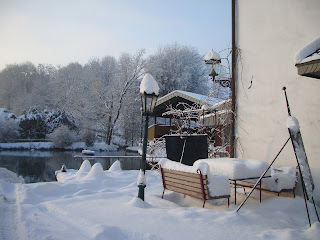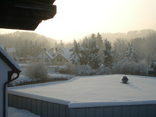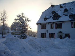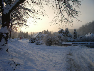 Tällaisissa jouluisissa tunnelmissa olemme viettäneet aaton ja joulupäivät. Täkäläiset eivät ole tottuneet jatkuvaan lumentuloon ja se saa ihmisten hermot kireille. Joka aamuiset lumenluonti-aamu-voimistelut eivät kiinnosta enää kai ketään muuta kuin minun miestäni, joka lähtee vapaaehtoisesti loma-aamuna kello 6.00 pihalle luomaan lunta ja nauttii siitä!! Hänestä se on kuin ilmaista kuntosalia.