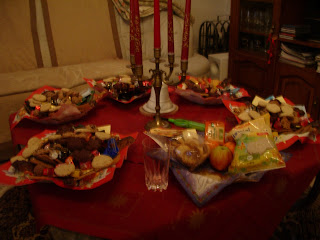 Joulumakeispöydän herkut houkuttelivat popsimaan jo salaa etukäteen ihania joululeivonnaisia, makeisia ja hedelmiä. Jokaiselle on omalla nimellä lautanen täynnä jouluherkkuja, joita sitten lahjojen jaon aikana napostellaan.