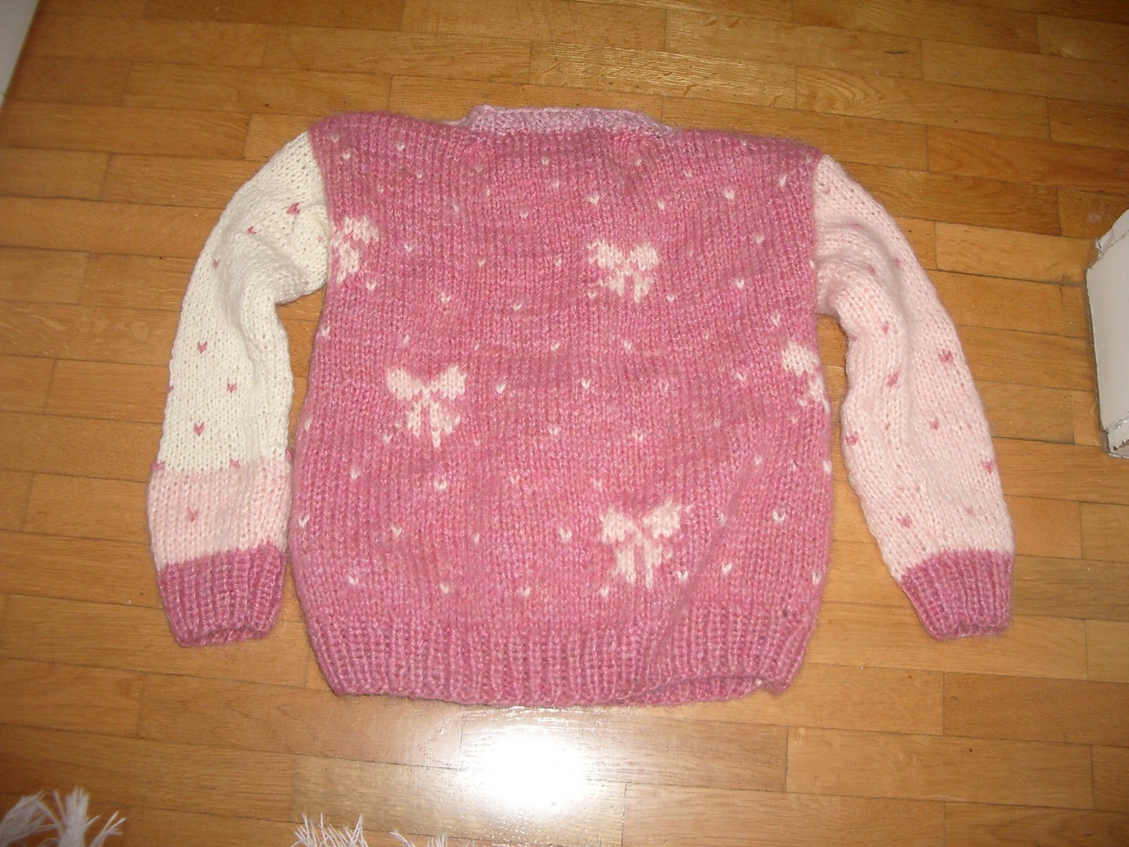| Iidan villapusero, joka alunperin oli tarkoitettu Annalle, mutta nyt se taitaa olla liian pieni Annalle. Vasemmassa hihassa näkyy langanvaihto, kun loppuunmyydyt langat loppuivat kesken ja piti löytää jotain vastaavaa. |