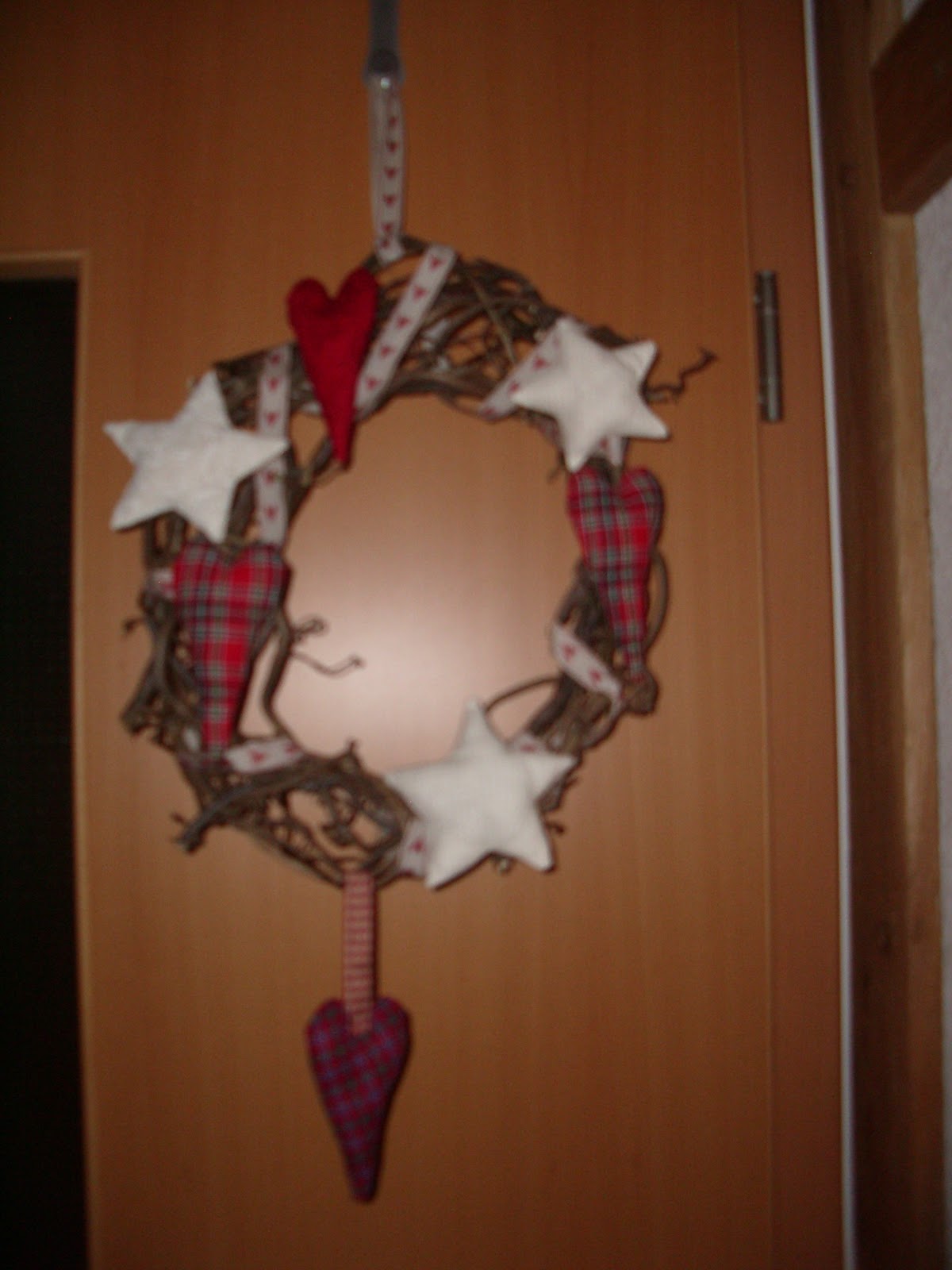 Ompelin valtavan kasan kangassydämiä ja tähtiä ja nyt niitä riittää vaikka ensi jouluun. Tein yhden kranssin riippukoivun oksista ja pelkistä valkoisista sydämistä. Se näytti hyvin suomalaiselta. Yksinkertaiselta. En millään olisi raaskinut luopua siitä, mutta halusin antaa sen lahjaksi hyvälle ystävälleni ja nyt se roikkuu muualla jouluista tunnelmaa tuomassa.