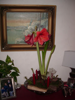 Olen joka vuosi tehnyt takkahuoneeseen amaryllis joulukoristeen. TÄnä vuonna kävi niin, että siitä tuli kaikessa kiireessä adventtikranssi. Olin niin tohkeissani vieraiden takia, etten yksinkertaisesti ehtinyt metsään hakemaan kuusenoksia, joten adventtikranssi jäi tekemättä. Sunnuntai aamuna istuimme kaikki kauniisti katettuun pöytään aamupalalle ja silloin sen huomasin: KRANSSI PUUTTUU. 4 punaista kynttilää amaryllisten seassa teki kukka-asetelmasta Adventtikranssin. Aamupala ja 1. Adventti oli pelastettu.