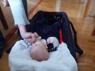 = taas olivat pienen kaksilahkeisen kanssa täällä. Sain onneksi häädettyä sen sätkivän ja pärisevän merkillisen vonkuleen istuimestaan muualle. Tuoli jäi minulle ja siinä oli todella hyvä istua. Minua varten oli jopa erikoinen roikkuva koriste, jota sain tassuilla heilutella. Tuo kantokassi alkaa käydä minulle jo ahtaaksi, joten tämä tuolintapainen on erittäin kätevä. Siinä voin istua, kun minua kannetaan. Tosin minua ei kannettu siinä, kun röykeästi vain nostettiin lattialle ja sätkivä kaksilahkeinen laitettiin takaisin tuoliin ja samantien hän hävisi ovesta ulos.