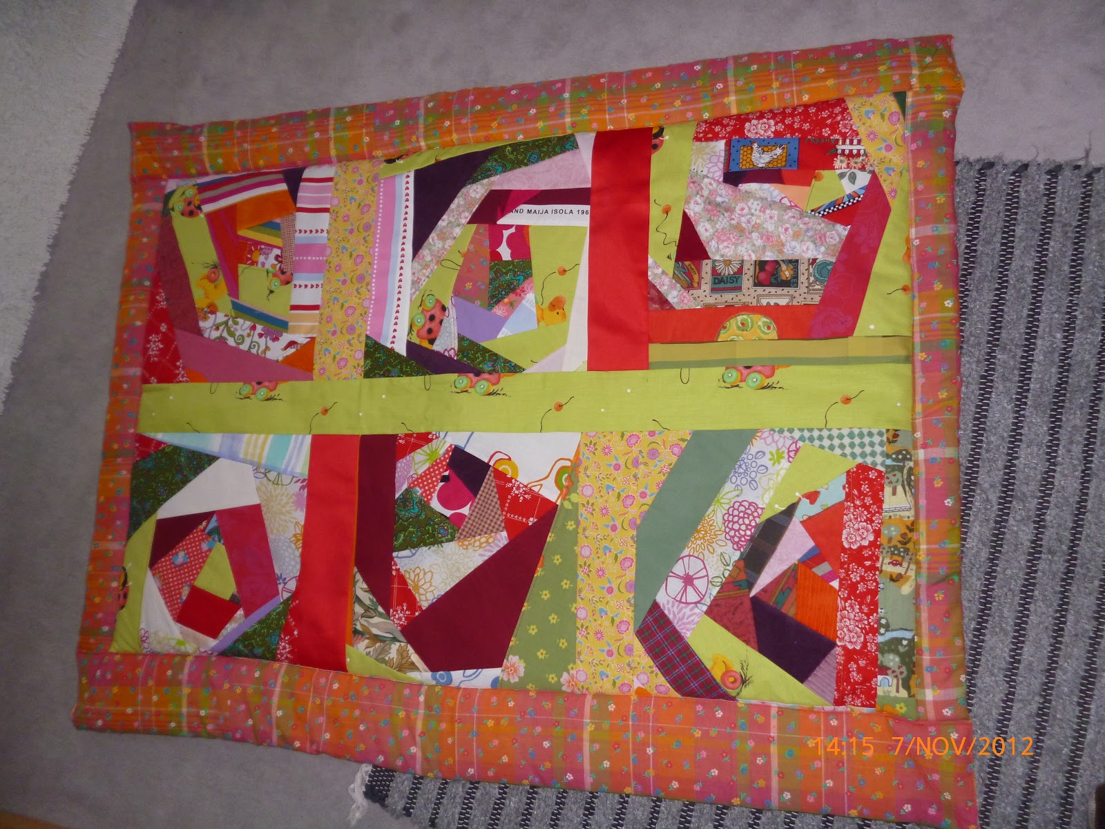 ja yksi vauvanpeitto vamistui graz-quilting tekniikalla, kun käytin kaikki loput pienet palat, joita talosta löytyi. Ja jäljelle jäi vielä monta laatikollista pieniä palasia seuraaviin tilkkutäkkeihin.