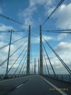 Tällä kertaa päätimme tehdä poikkeuksellisen pitkän laivamatkan ja tulimme Tukholmasta Turkuun, mutta lähdimmekin Helsingistä Tukholmaan. Poikkesimme myös totutusta Helsingör-Helsingborg reitiltä ja ajoimme Öresundin sillan kautta. Silta on hiukan halvempi kuin lauttayhteys ja jotenkin se tuntui huomattavasti helpommalta, kun ei tarvinnut ajaa laivaan ja istua taas jossain tyhmässä kahvilassa ja odottaa vain ylipääsyä. Nyt ajaa hurautimme sillan yli ja taivastelimme uskomatonta näköalaa - kun aurinko vielä paistoi ja näkymä oli upea. Lähes kahdeksankilometrin pituinen silta on melkoinen taidonnäyte. Varsinkin, kun sillalle ajettaessa tunneli menee ensin meren alta ennen kuin nousee sillalle.