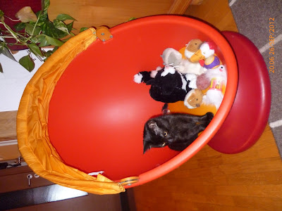 toissapäivänä toivat kotiin sellaisen hassun, pyörivän tuolin, joka sopii kuin nakutettu minulle ja leluilleni. Olin aivan innoissani uudesta tuolistani, kunnes taas yksi kaksilahkeinen - sellainen, joka juoksee perässä ja työntää palloa nenäni alle muka leikkiäkseen kanssani - istahti tuoliin ja kaikki hihkuivat innoissaan. Tuoli ei siis ollutkaan minulle. En aio ottaa tätä henkilökohtaisesti, sillä pieni kaksilahkeinen on vain kerran viikossa täällä. Muut ajat minä istun tuolissaNI.