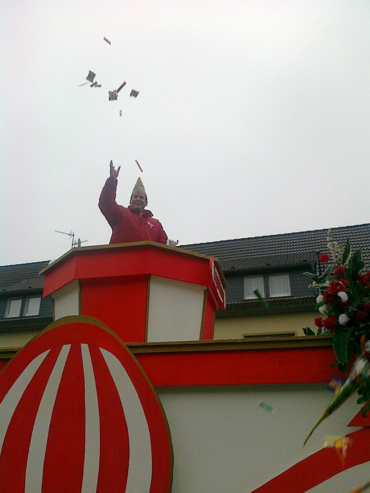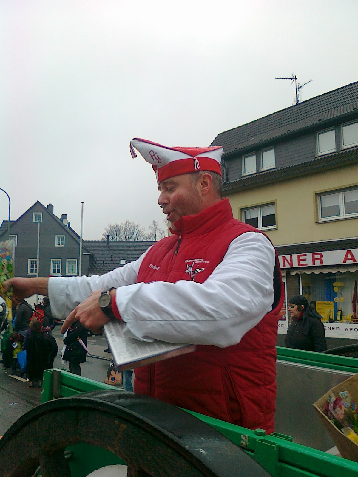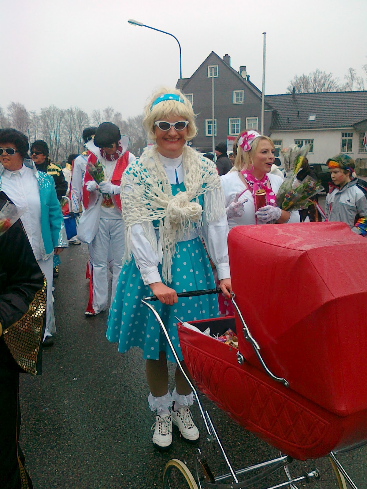 Naapurimme jakamassa "Röschen und Kamelle" - ruusuja ja karamelleja - kadunvarrella juhliville becheniläisille. Facebookista löytyy myös Bechenin Karnevalsfreunde-sivu, jos haluaa katsoa mitä täkäläiset karnevalistit oikein puuhaavat. Karnevaalien kohokohta, Rosenmontag - kulkue Kölnissä maanantaina kerää tuhansia osallistujia ja puolimiljoonaa katsojaa katujen varsille. Viime vuonna tunnelma oli katossa, sää oli upea ja kulkueet todella loistavia (http://www.youtube.com/watch?v=_rmUC6BF-ec&feature=related). Kölnin karnevaalien "Dreigestirn" = Prinssi, Maajussi ja Neitsyt ovat kaikki miehiä. Se on aina ollut tapana.