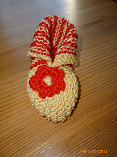 Eilen illalla näpertelin uudesta puuvillalangasta pienen pienen tossun, toinen on vielä puikoilla. Ohjeen löysin eräästä blogista, nimeltä "puikkojen polut". Sieltä löytyy tarkka ohje näihin tosi söpöihin ja erittäin yksinkertaisiin tossuihin. Kannattaa katsoa.