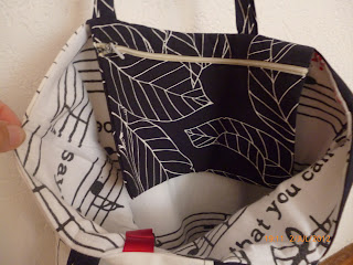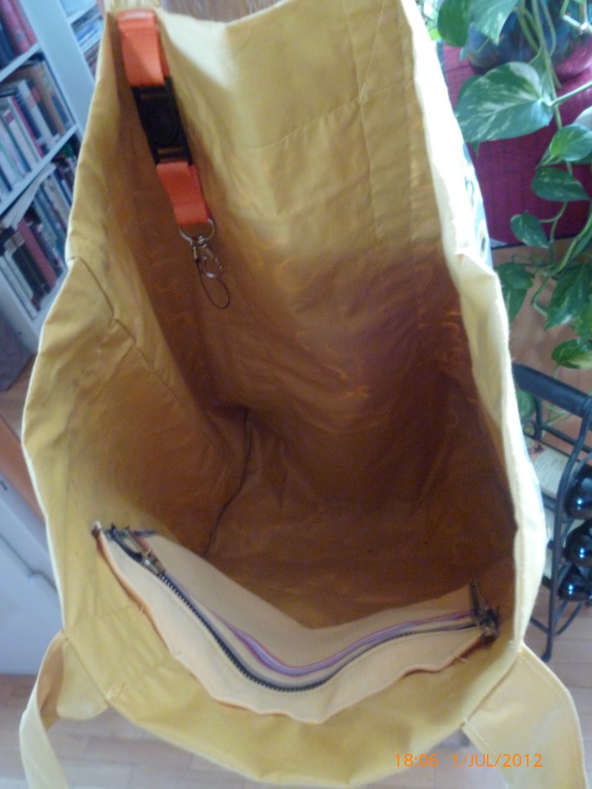 jäädä hihnojen ompelun alle. Piti vähän keplotella, etten ommellut taskua kiinni. Sisällä on perinteiseen tapaan avainrenksu. Sen olen todennut erittäin käytännölliseksi, kun kassiin on sullottu maitopurkit ja pakastepizzat ja sitten seison vesisateessa kotiovella ja etsin avainta kassin pohjalta - vaan enpä etsi enää, kun avaimet ovat aina helposti löydettävissä avainrenksusta.