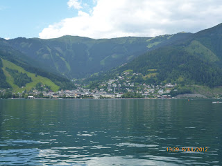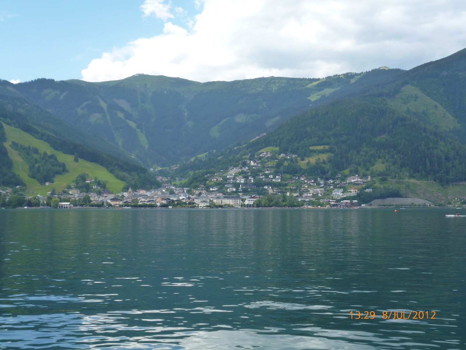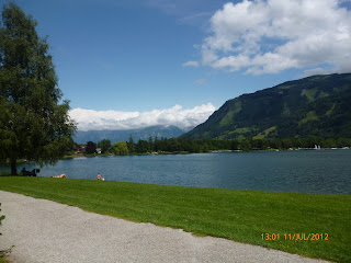 Näkymä Zell am See'n toiselta puolelta. Täällä istuimme auringonpaisteessa ja nautimme lounaan ankkojen ja kalojen seurassa, takanamme 8 komeaa italialaista moottoripyöräilijää. Alppitie on vienyt viikon sisällä jo kaksi moottoripyöräilijää. Tänään lensi kaksi pelastushelikopteria vuoria kohti, joten voi olla, että kuolleiden määrä tällä viikolla nousee...