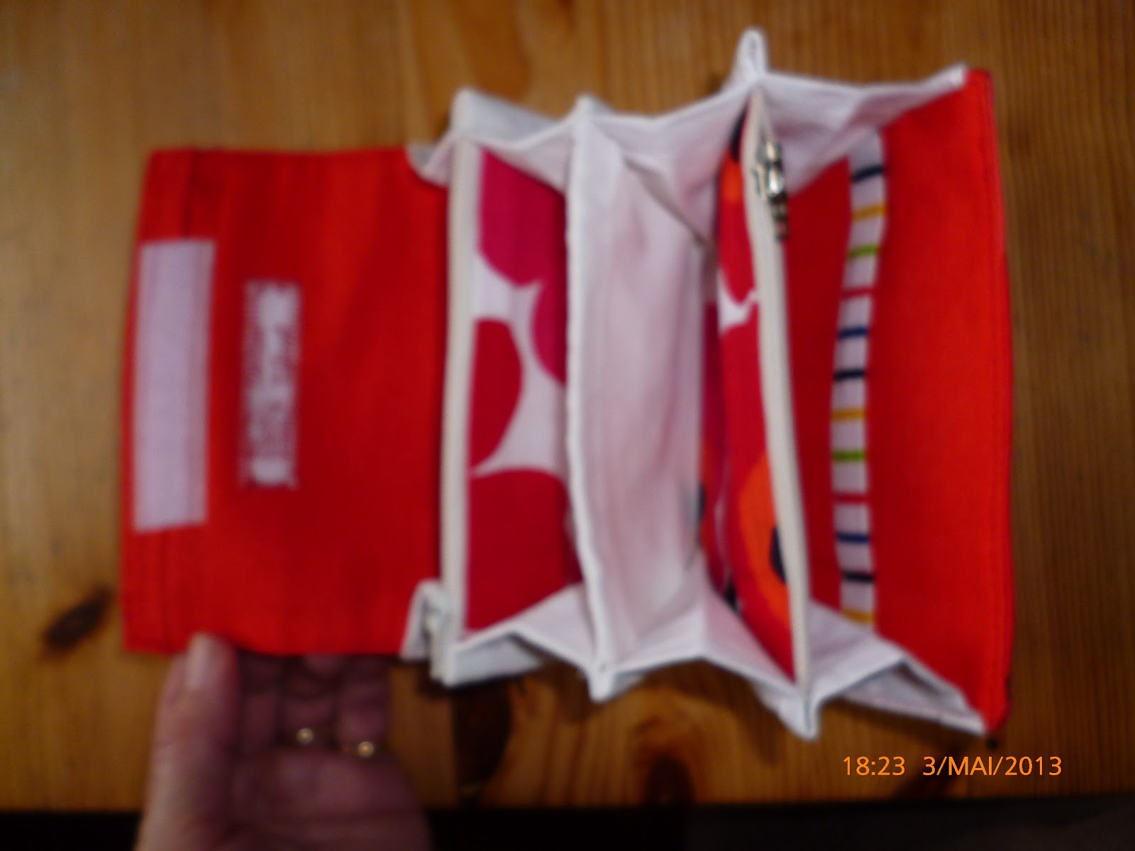 Marimekkokankaasta tehty lompakko perheen äidille.Tämän kanssa taistelin yhden iltapäivän. Oli se sen verran monimutkainen tehdä, vaikka ohjeetkin olivat vieressä.