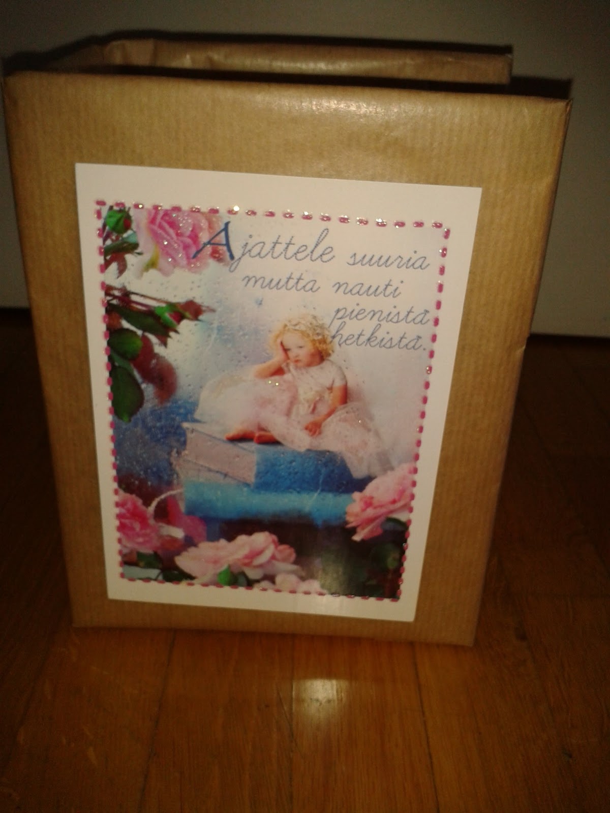 Kissanruokalaatikosta leikkasin ensin yläreunan pois ja Tein syvennyksen kapeaan päähän. En leikannnut kokonaan "lämpärettä" irti vaan kiinnitin sen nitojalla jolloin reunasta tuli vahvempi. Yhden laatikon päällystin ruskealla pakkauspaperilla, jonka molemmille puolille liimasin kauniit kortit. Siinä laatikossa säilytän kortteja. Toiseen liimasin Ikean luettelosta sivuja ja siinä on valokuvia, joita lajittelen liimattavaksi kansioihin.