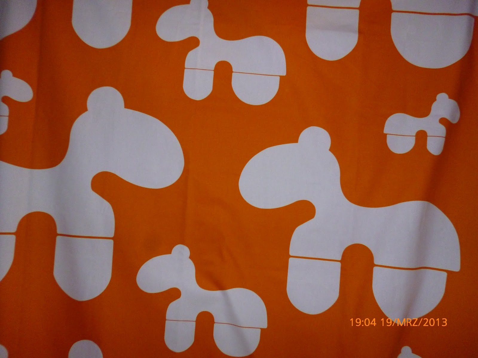 zwei orange-farbige PUPPYs und eine PONY-Tasche, auf der Marimekko-Tischdecke.