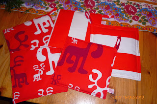 Olen yrittänyt olla ostamatta joululahjoja. Sitä vastoin ompelen kaikenlaista pientä joululahjoiksi. Nyt innostuin tekemään patalappuja, kun appivanhempani saivat uuden keittiön uuteen asuntoonsa ja uuteen keittiöön täytyy saada myös puhtaat, hienot patalaput a la Eero Aarnio ja Marimekko. Suomalaista designia.