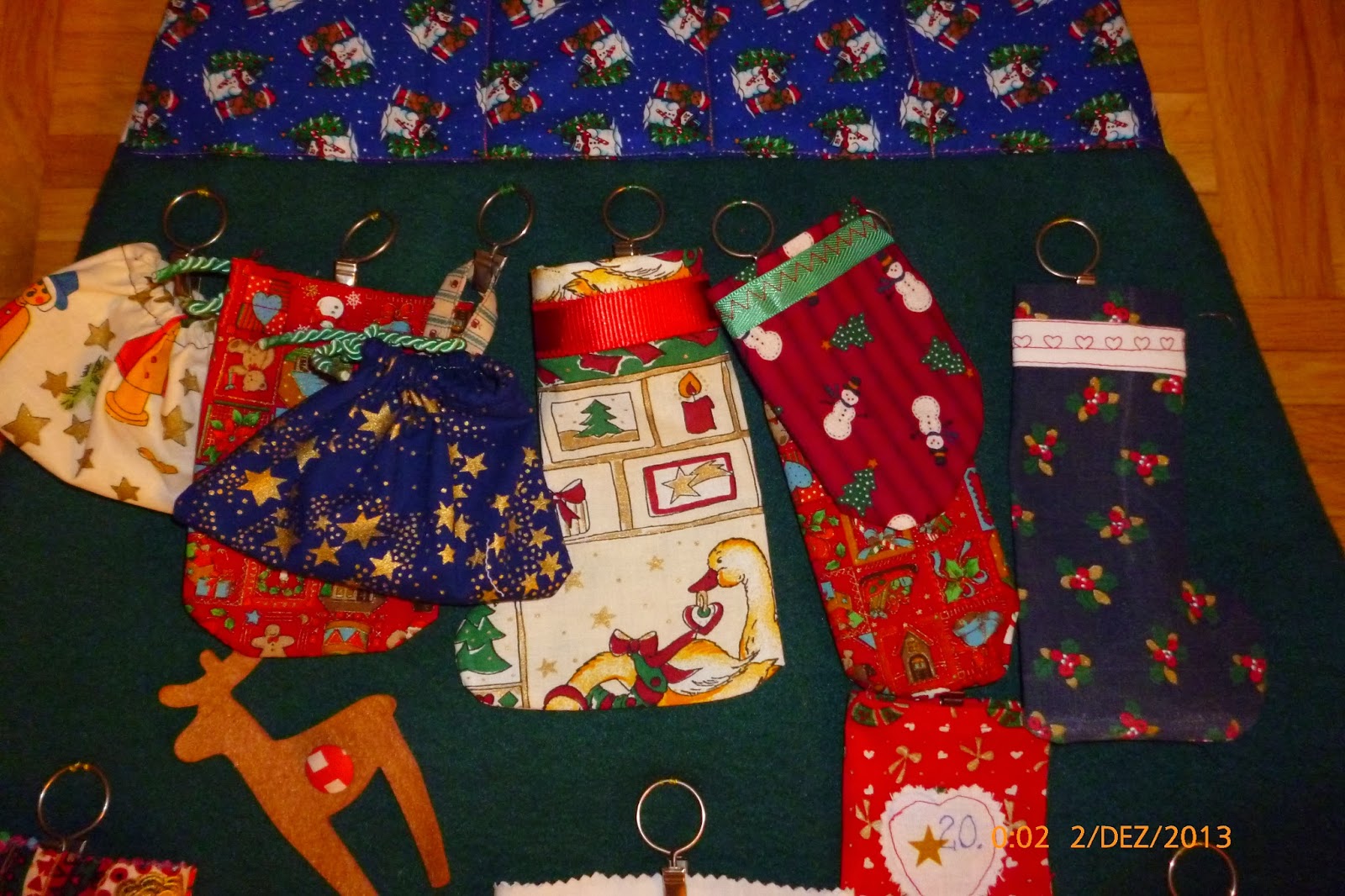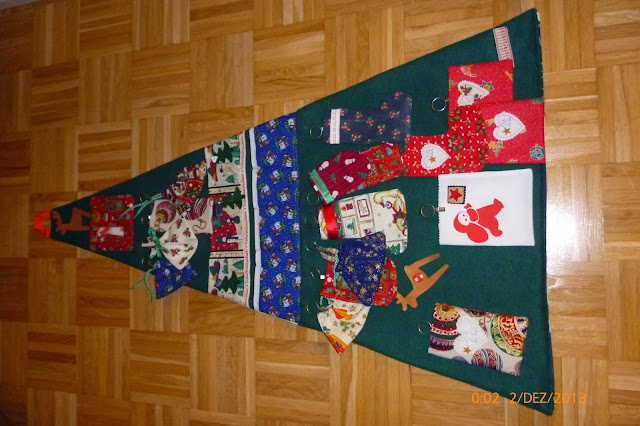 Ei viimehetkellä vaan viimeisellä hetkellä! Valmista tuli, vaikka tiukkaa piti. Olin luvannut tehdä kaksi isoa adventtikalenteria. Onneksi tajusin ajoissa, ettei aika riitä vaikka tekisin yötä myöten töitä, ja tilasin toisen netin kautta. Kuusipuu, joka on yli metrin korkuinen. Päätin tehdä samanlaisen myös Miialle ja leikkasin 24 luukkua erivärisistä joulukankaista ja ompelin niihin numerot. Ostin vihreää verkakangasta ja leikkasin kuusen (kartion muotoisena) ja huomasin, etteivät suuret taskut mahdu mitenkään kuuseen. Istuin kangaskasan keskellä ja mietin. Sitten rupesin ompelemaan pieniä pussukoita, joiden suihin käänsin nauhakujan. Liian aikaa viepää - totesin puolessa välissä kalenterin tekoa ja löysin yhdestä purnukasta vanhoja verhon pidikkeitä. Ompelin niitä limittäin ja rivittäin verkakankaaseen ja loput pussit tein ilman nauhoja. Verhonnipsuttimiin kiinni ja niin pussukat voi tarpeen tullen irrottaa kuusesta.
