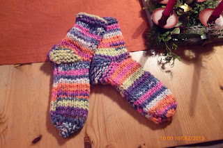 paksut ja kirjavat. Ovat vähän tavallisesta sukasta poikkeavat tuon kantapään takia, mutta en ole vieläkään oppinut kutomaan oikeanlaista kantapäätä, joten minun sukkani ovat tulevaisuudessa kahdenpuikon sukkia ennen kuin opin tuon suuren salaisuuden; kantapään!