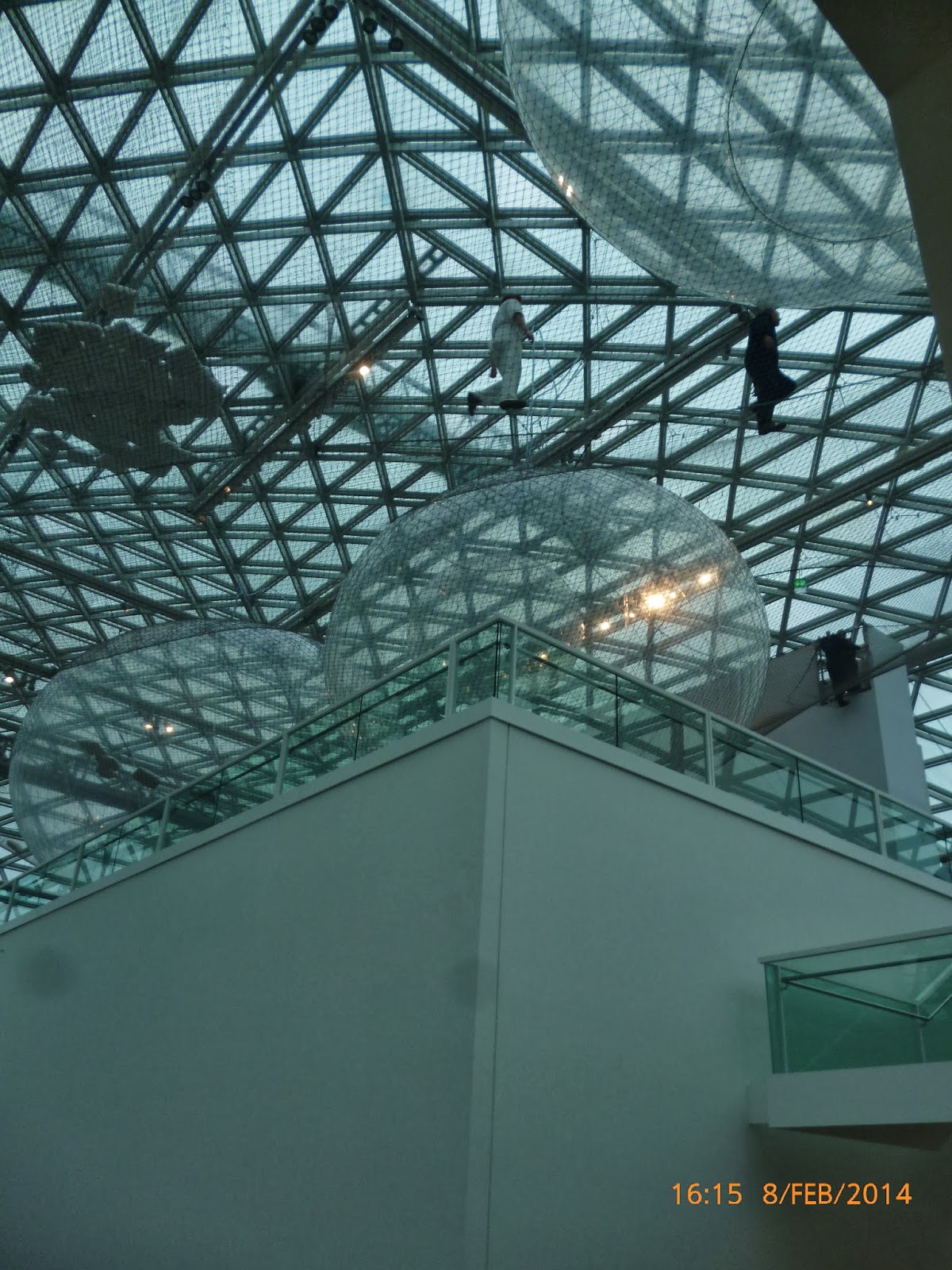 Unilauluista kulttuuriin. Düsseldorfissa on esillä tomás Saracenon näyttely "in orbit", joka on avattu viime kesäkuussa ja jatkuu vielä tämän vuoden kesäkuuhun. On hiukan vaikea puhua näyttelystä, kun taiteilija on kasvattanut hämähäkin seittejä pimeässä huoneessa ja rakentanut niiden mallin mukaan mielettömän metalliverkoston 25 metrin korkeuteen museon sisäkattoon. Metalliverkkoon on mahdollista mennä tutustumaan yläpuolelta eli kävellä verkon sisällä. Tunne on aivan uskomaton. Kuin vaappuisi avaruudessa. Verkko on metallista, mutta antaa periksi kuin riippumatto. Välillä kävely tuntuu kevyeltä hyppelyltä - kunhan ei tuijota 25 metrin syvyyteen ja alapuolella ihmetteleviin ihmisiin. Verkostoon on turha lähteä testaamaan onko korkeanpaikankammoinen vai ei. Siinä vaiheessa päässä pyörii ja vatsassa velloo. Verkkoon pääsee vain 10 ihmistä yhtä aikaa ja kaikki pukevat koko haalarit, ettei mitään vaan pääse putoamaan vaatteista alapuolella kävelevien ihmisten päälle. Minun piti antaa jopa sormukset pois, etten vain jää kiinni verkkoon niistä.