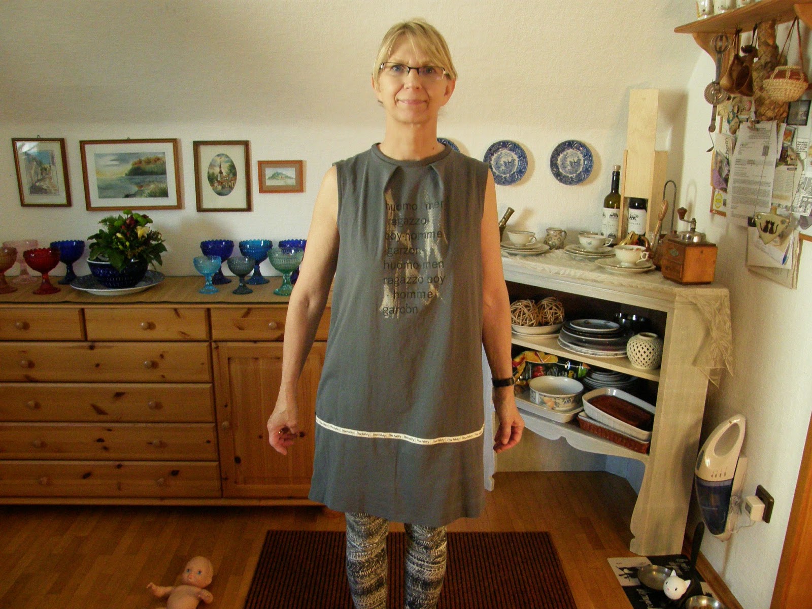 Naapurini teki mekon häihin. Sain kaavat lainaksi ja kangaskaupastani löytyi vanha miesten t-paita, jonka etupuolen kuva veti puoleensa; "huomo, men, ragazzo-boy..." . Näinä hiukan epäselvän sukupuolen aikoina (Itävallan voittaja mies-nainen!) voi hyvin pistää nainenkin t-paidan päälleen, jossa lukee monella kielellä "mies".